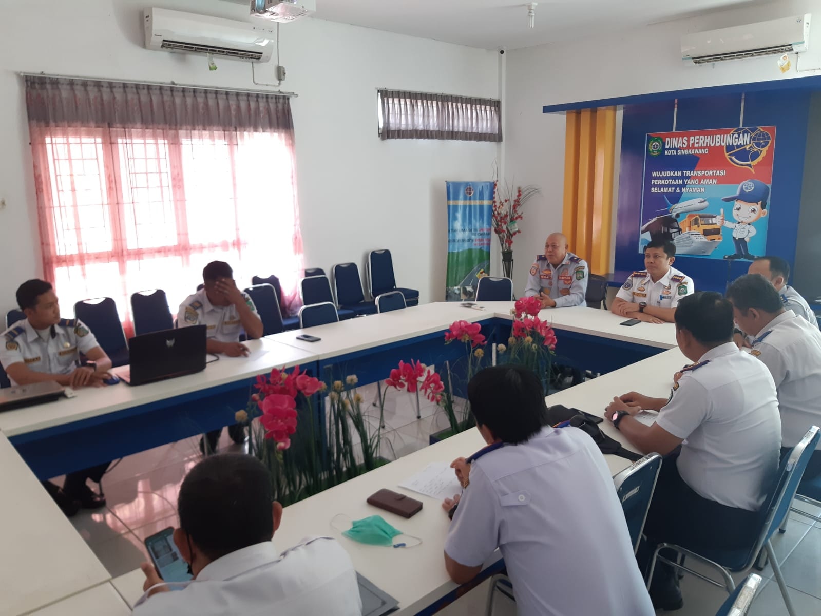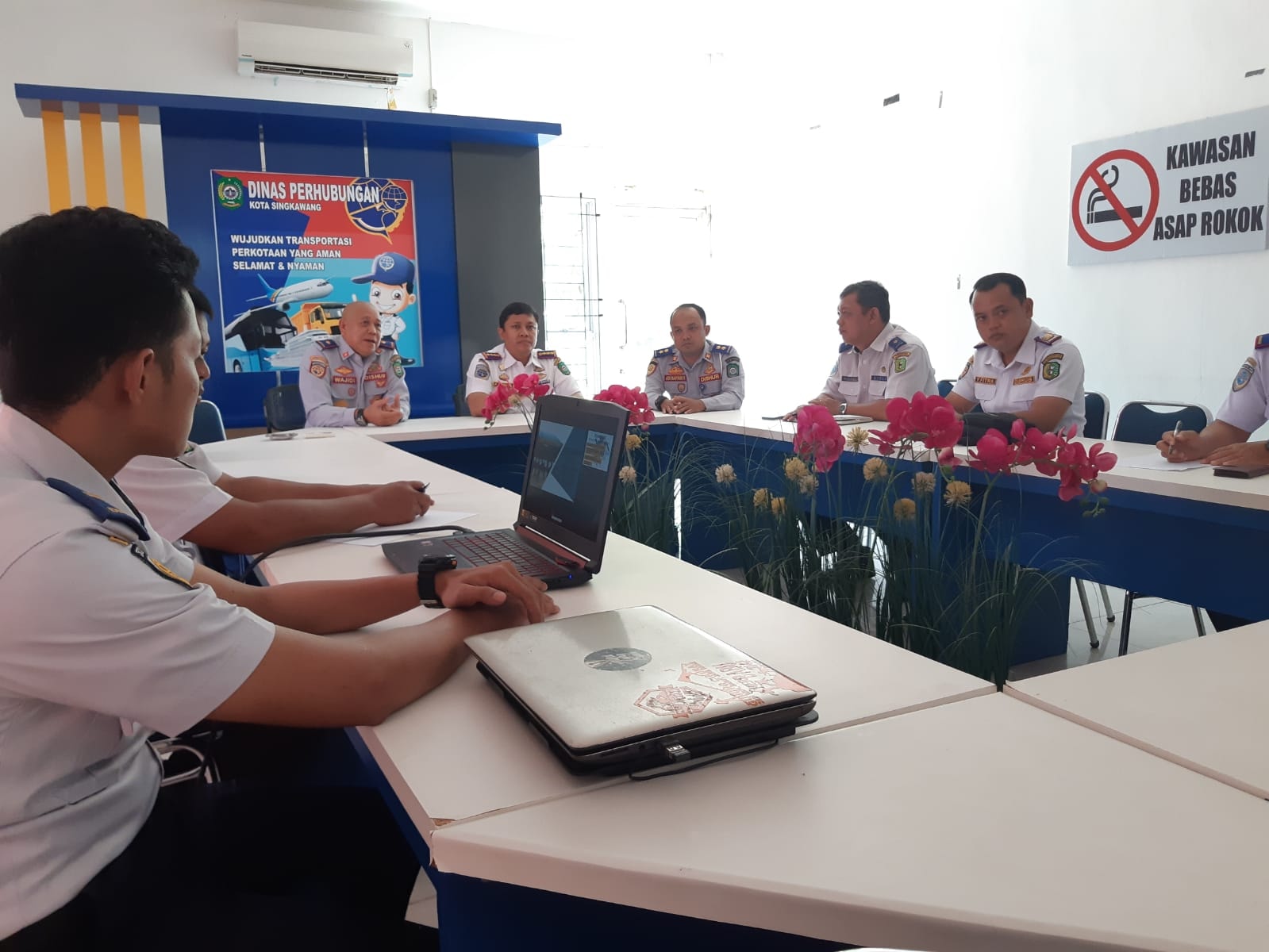 Kepala Dinas Perhubungan Kota Singkawang Menerima kunjungan Studi Visit dari Kepala Dinas Perhubungan Kabupaten Bengkayang, yang diwakili oleh Kabid Lalu Lintas, Alexander Haloho beserta kasi dan staf di aula ruang rapat.