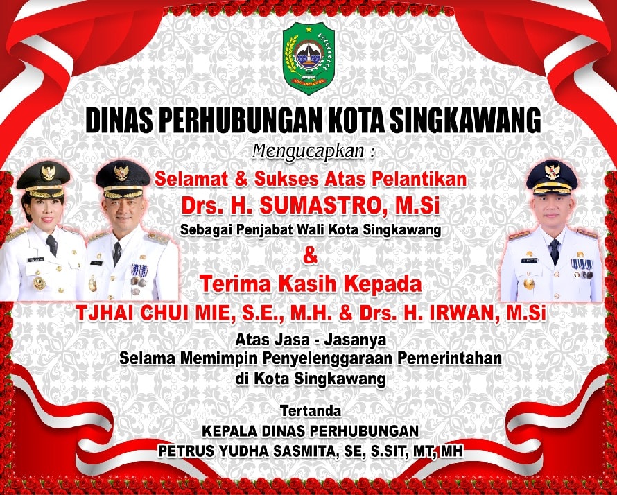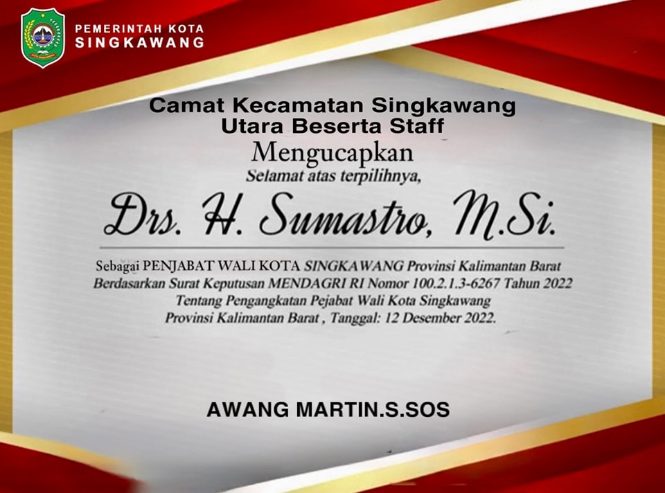 Salah satu panutan dan Mentor Bapak Drs. H. Sumastro, M.Si Sekretaris Daerah Kota Singkawang akan dilantik menjadi Penjabat (Pj) Wali Kota Singkawang pada hari Minggu, 18 Desember 2022 di Balai Petitih Kantor Gubernur Kalimantan Barat. Terima kasih ibu Tjhai Chui Mie, SE, MH dan Bapak Drs. Irwan, M.Si (Wali Kota dan Wakil Wali Kota periode Tahun 2017-2022 yang telah mendedikasikan diri dalam memimpin dan membangun Kota Singkawang.