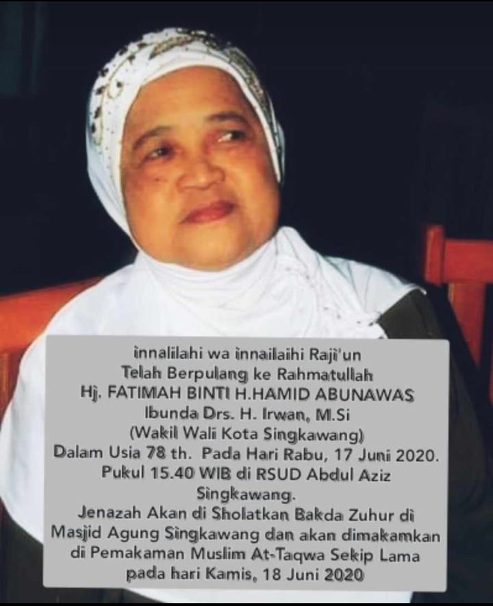 Innalillahi wainna ilaihiraji’unKeluarga Besar Dinas Perhubungan Kota Singkawang mengucapkan turut berduka cita sedalam-dalamnya atas meninggalnya ibu HJ. FATIMAH BINTI HAMID ABUNAWAS ibunda dari Bapak H. Irwan (Wakil Walikota Singkawang) semoga Amal ibadah Almarhumah diterima disisi Allah SWT dan keluarga yang ditinggalkan diberikan ketabahan dan kesabaran Aamiin